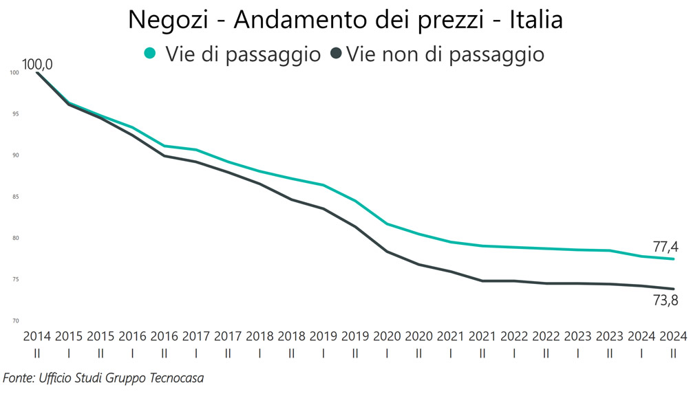 Negli ultimi 10 anni i prezzi per i negozi sulle strade di passaggio sono diminuiti del 22,6%, su quelle in vie non di passaggio del 26,2%: questo trend sicuramente ha dato una spinta all’acquisto.