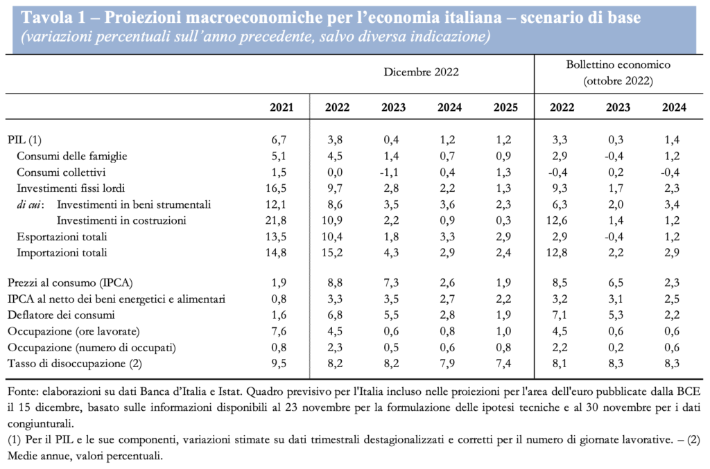 Rispetto alle proiezioni pubblicate in ottobre, la crescita del prodotto è rivista al rialzo per quest’anno e il prossimo, grazie ad andamenti più favorevoli nel terzo trimestre dell’anno in corso (che determinano un effetto di trascinamento anche sul prossimo anno), e lievemente al ribasso nel 2024, per via degli effetti di un’inflazione più elevata. I consumi delle famiglie, dopo una crescita sostenuta nei trimestri centrali del 2022, che determina anche un forte effetto di trascinamento sul 2023, diminuirebbero alla fine dell’anno in corso e nei primi mesi del prossimo, risentendo dell’impatto del marcato aumento dei prezzi sul reddito disponibile; rimarrebbero deboli nella restante parte del 2023, per accelerare gradualmente in seguito, grazie alla discesa dell’inflazione.