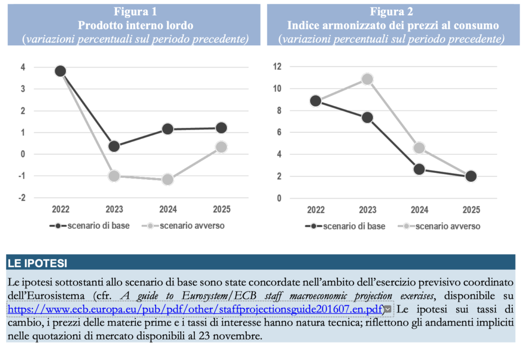 Come di consueto, lo scenario non tiene conto di ulteriori misure di politica economica che potrebbero essere adottate per mitigare gli sviluppi sfavorevoli determinati dal materializzarsi dei fattori di rischio esaminati. Nel complesso, in questo scenario il prodotto si ridurrebbe di circa l’1 per cento sia nel 2023 sia nel 2024 e rimarrebbe poco più che stagnante nell’anno successivo. L’inflazione al consumo salirebbe ulteriormente, avvicinandosi all’11 per cento nel 2023, per poi scendere progressivamente, riportandosi al 2,0 per cento nel 2025.