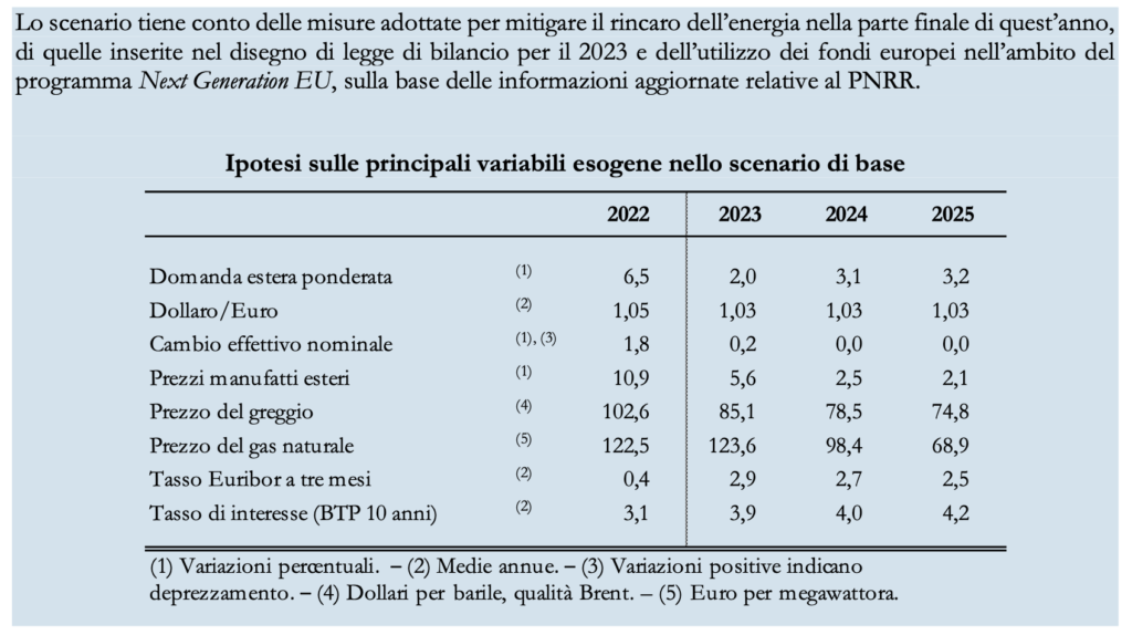 Le proiezioni qui presentate, ancorché di natura puntuale, hanno natura indicativa dato l’attuale contesto di grande incertezza, connessa soprattutto con l’evoluzione del conflitto in Ucraina. In uno scenario di base si assume che le tensioni associate alla guerra rimangano molto elevate nella prima parte del prossimo anno e si attenuino solo gradualmente lungo l’orizzonte previsivo, contribuendo a mantenere elevati i prezzi delle materie prime, comprimendo la fiducia e frenando gli scambi internazionali. In questo scenario si esclude una sospensione permanente delle forniture di materie prime energetiche dalla Russia, le cui conseguenze per l’attività economica vengono esaminate in uno scenario avverso1.