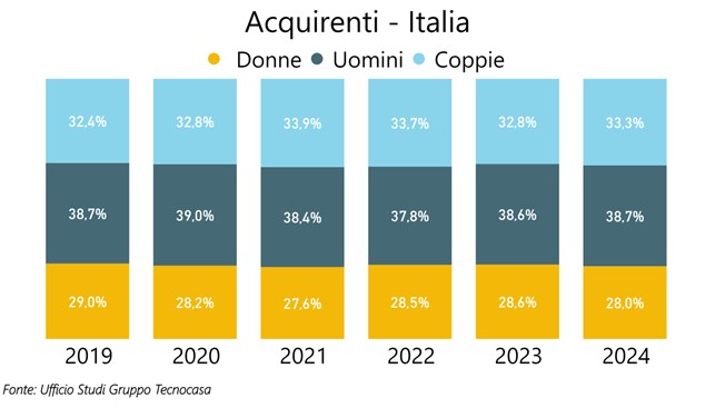 Secondo l’analisi condotta dall’Ufficio Studi Gruppo Tecnocasa su dati provenienti dalle agenzie del Gruppo, nel 2024 la componente femminile che acquista casa è pari al 28,0%, dato abbastanza invariato negli ultimi anni, mentre il 38,7% è rappresentato da uomini e il 33,3% da coppie.