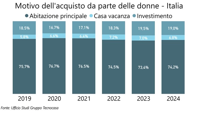 Tra le motivazioni che spingono all’acquisto prevale l’abitazione principale (74,2%), mentre gli acquisti per investimento si attestano al 19,0%, quota in leggero calo rispetto al 2023 ma comunque più alta rispetto agli anni precedenti. È un trend in linea con il lieve ribasso della percentuale di acquisti per investimento rilevato in generale a livello nazionale.