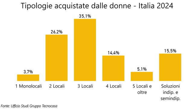 Del 19,0% delle donne che ha acquistato nel 2024 per investimento, il 27,6% ha un’età compresa tra 45 e 54 anni, a seguire con il 23,6% le donne con un’età compresa tra 55 e 64 anni. Si investe quindi una volta raggiunta una certa stabilità lavorativa. La tipologia più acquistata per investimento è il bilocale, che si conferma quella più ambita dagli investitori donna (33,0%), quota in calo rispetto a un anno fa.