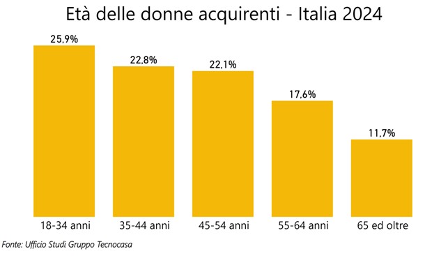 Il 70,8% delle donne che acquistano ha un’età compresa tra 18 e 54 anni, l’età media di acquisto nel 2024 si attesta sui 45 anni, in calo rispetto al 2023 quando arrivava di 45,6 anni.
