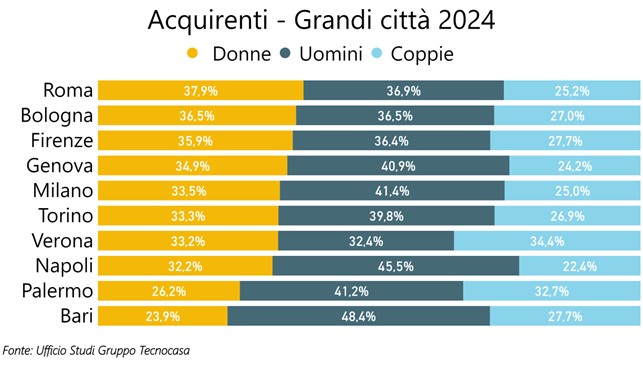 Se si guarda alle grandi città si nota come la percentuale più elevata di acquisti da parte di donne si registra a Roma (37,9%), seguita da Bologna (36,5%) e da Firenze (35,9%). In fondo alla lista si trovano Palermo e Bari, dove le quote di acquisto da parte di donne sono inferiori al 30%.